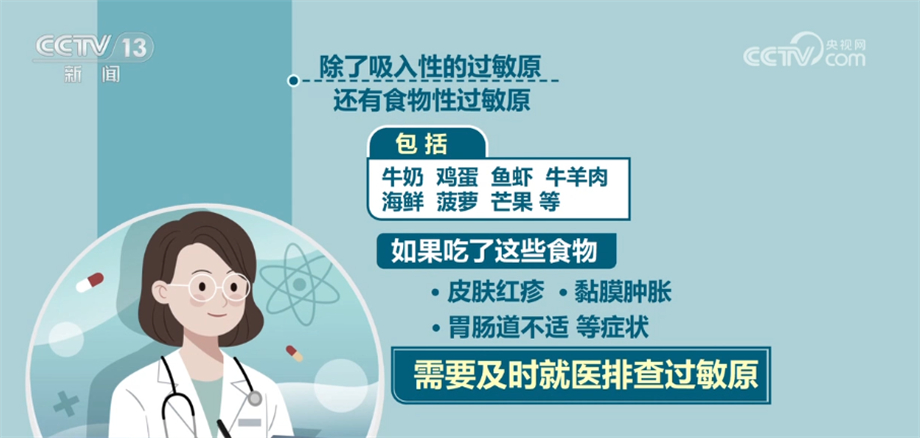 除了吸入性的过敏原,还有食物性过敏原,包括牛奶、鸡蛋、鱼虾、牛羊肉、海鲜、菠萝、芒果等,如果吃了这些食物出现皮肤红疹、黏膜肿胀、胃肠道不适等症状,需要及时就医排查过敏原。
