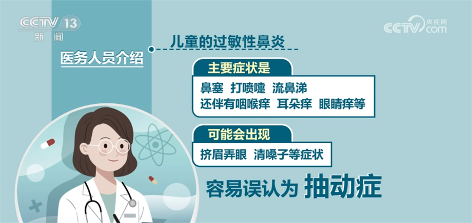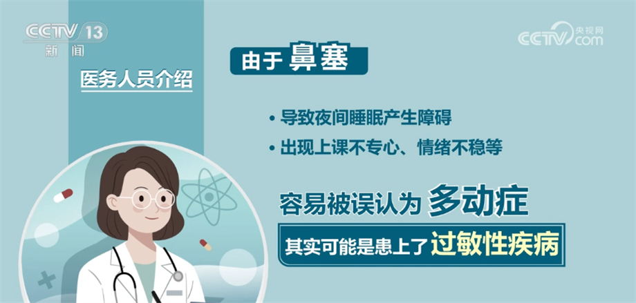 医务人员介绍,儿童的过敏性鼻炎主要症状是鼻塞、打喷嚏、流鼻涕,还伴有咽喉痒、耳朵痒、眼睛痒等,可能会出现挤眉弄眼、清嗓子等症状,容易误认为抽动症。另外,由于鼻塞导致夜间睡眠产生障碍,出现上课不专心、情绪不稳等,容易被误认为多动症,其实可能是患上了过敏性疾病。