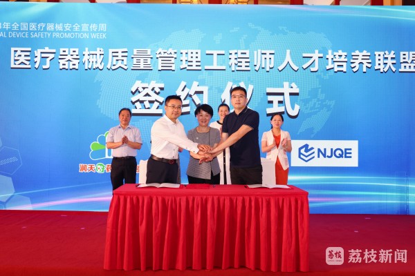 江苏润天医药连锁药房有限公司在全国首创医疗器械质量管理工程师制度,在本次活动中进行了大力推广,该公司总经理崔颖露介绍了实行医疗器械质量管理工程师的经验做法,并为公司首批医疗器械质量管理工程师颁发证书。活动现场,江苏润天医药连锁药房有限公司、南京市质量技术监督综合服务中心、江苏卫生健康职业学院共同签署了《加快医疗器械质量管理工程师人才培养战略协议》,充分发挥各方优势,完善人才培养模式,培养复合型医疗器械质量管理人才,为群众安全用械保驾护航。