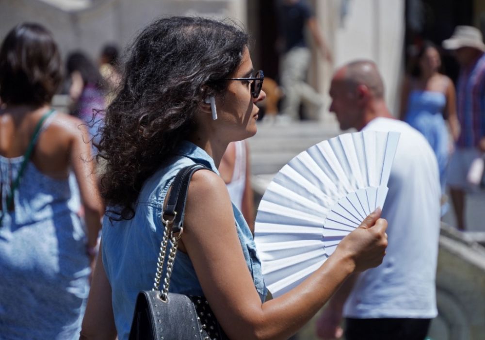 7月10日,一名女子在意大利罗马街头扇扇子降温。新华社记者金马梦妮摄