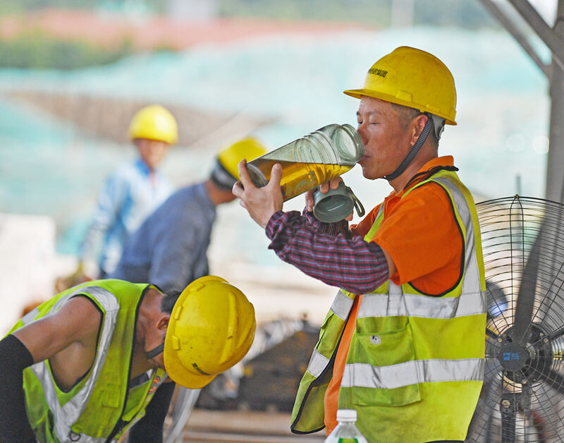 常州市于7月11日入伏。当天下午3点左右,正是一天中较热的时段,在省重点项目——湖滨水厂建设工地,工人们正头顶烈日,战高温、抓生产。据介绍,该项目正在地下蓄水构筑物施工的关键阶段,每天平均有近200名工人施工。为迎战伏天,项目方多聚并措错峰避高温,为工人提供排风扇、防暑药品、大麦茶等。