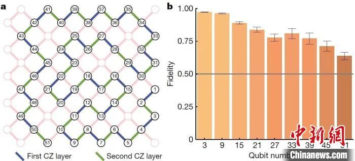 利用“祖冲之二号”完成的51比特一维簇态制备的线路及量子态保真度结果。中国科大 供图
