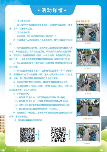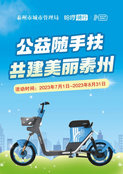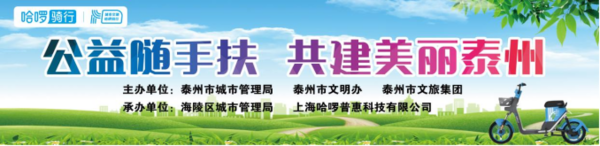 本次公益行动将一直持续至8月31日,泰州用户可通过提交前后治理对比图参与其中,每次有效参与都可获得一次免费骑行奖励,参与公益次数最多的前10名,还会额外获得一张哈啰共享助力车骑行月卡。更多详情可以登录哈啰APP或者支付宝哈啰小程序,进入公益“随手扶”专题页面了解。