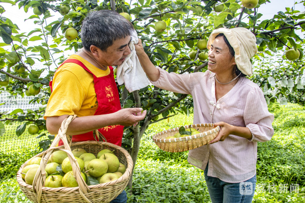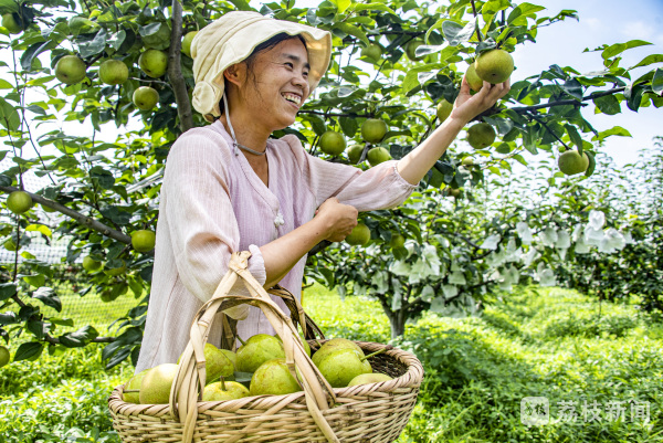 近日,位于南京市溧水区东屏镇的果农正在忙着采摘翠冠梨。这家公司引种的翠冠梨挂满了枝头,一派丰收的景象。