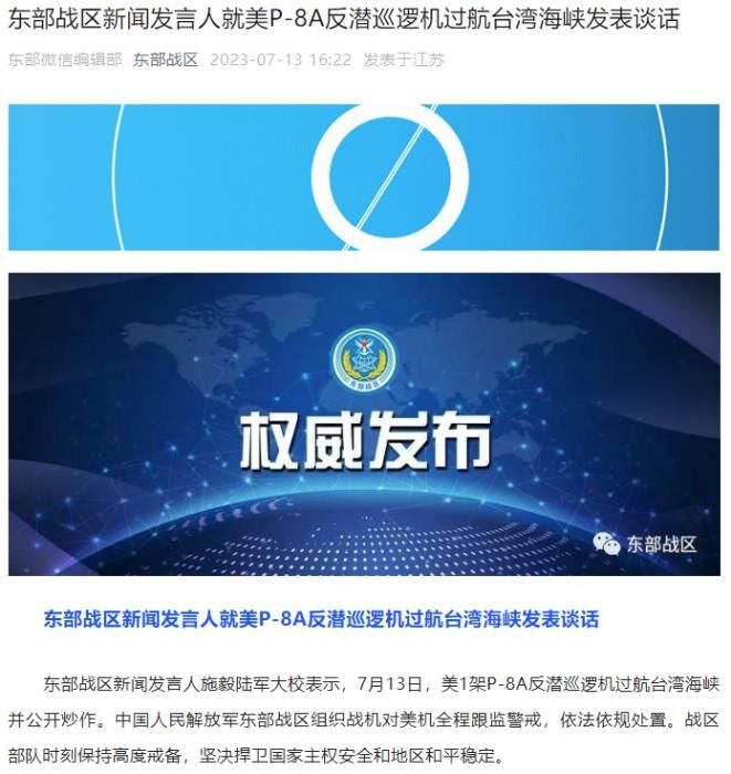 东部战区新闻发言人施毅陆军大校表示,7月13日,美1架P-8A反潜巡逻机过航台湾海峡并公开炒作。中国人民解放军东部战区组织战机对美机全程跟监警戒,依法依规处置。战区部队时刻保持高度戒备,坚决捍卫国家主权安全和地区和平稳定。