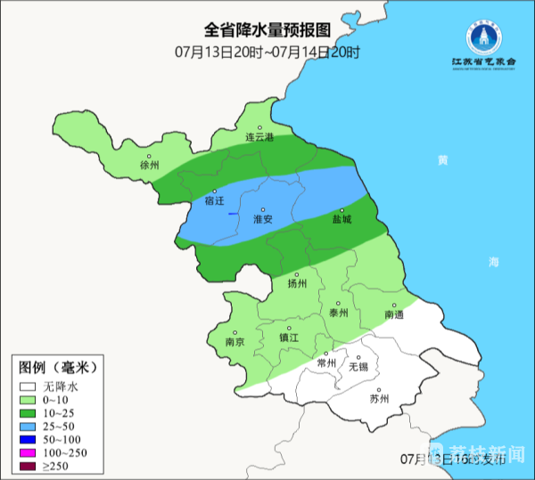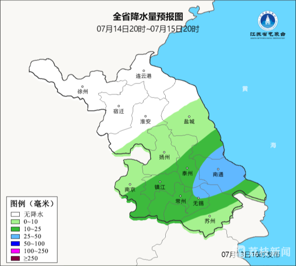 7月14日20时至7月15日20时,淮河以南地区阴有阵雨或雷雨,其中江淮之间南部和沿江苏南地区雨量中等,局部大到暴雨,其他地区多云。最高温度:全省32~33℃;最低温度:本省西北部地区25℃左右,苏南地区28℃左右,其他地区26~27℃。沿淮和淮北地区西南风,其他地区西南风转偏东风,风力4-5级阵风6级,有雷雨地区雷雨时短时阵风8级左右。