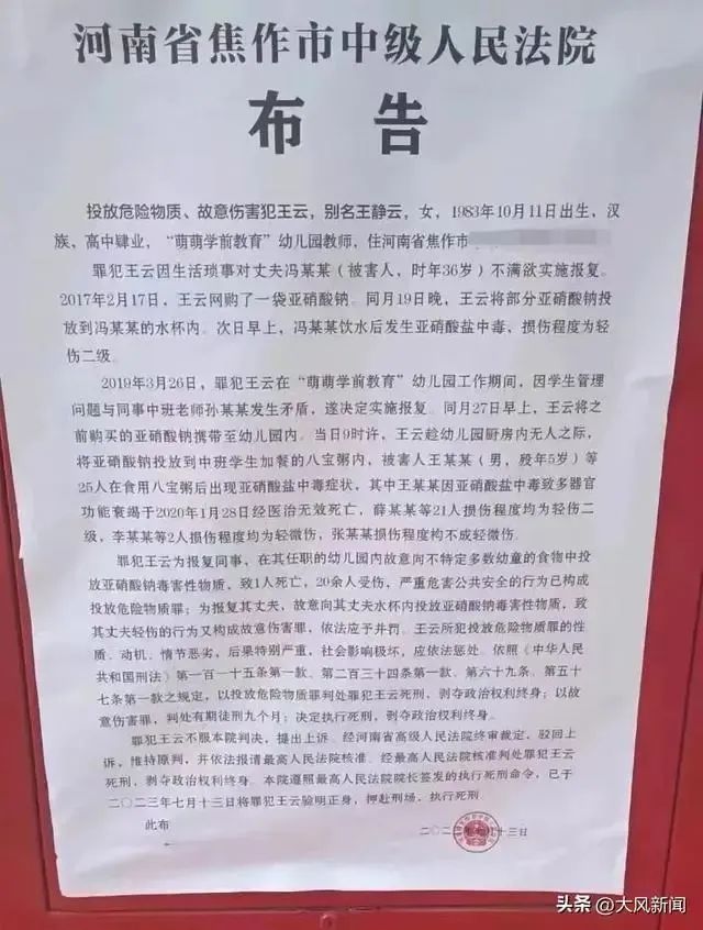 7月14日,华商报大风新闻记者从河南省焦作市中级人民法院证实,致25名幼儿中毒的王云,7月13日被押赴刑场,执行死刑。