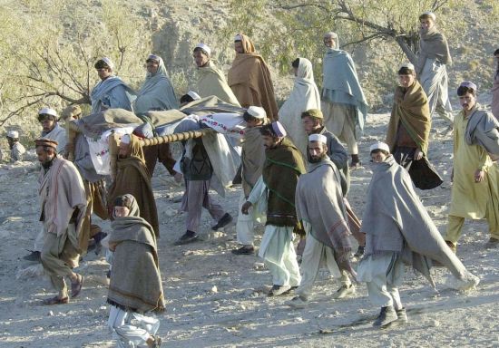 这是2001年12月19日,阿富汗托拉博拉地区的一群村民为一个被集束炸弹炸死的22岁年轻人送葬。这名年轻人在捡柴火的时候被一枚集束炸弹炸死。新华社发