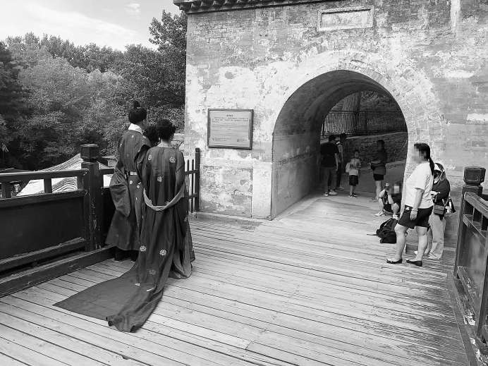 来到颐和园寅辉城关前,过道上几位身着古装的人站在栏杆旁摆着姿势,一位摄影师蹲在几米外的门洞内调整着拍摄角度,身旁站着拎包的助理。在他们身后,游客们干巴巴等着,“不好意思打扰人家拍照。”几分钟后这位摄影师终于站起来,游客们才赶忙走过。