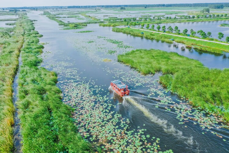 游船行驶在白马湖上,构成一幅人与自然和谐共处的美丽乡村新画卷。