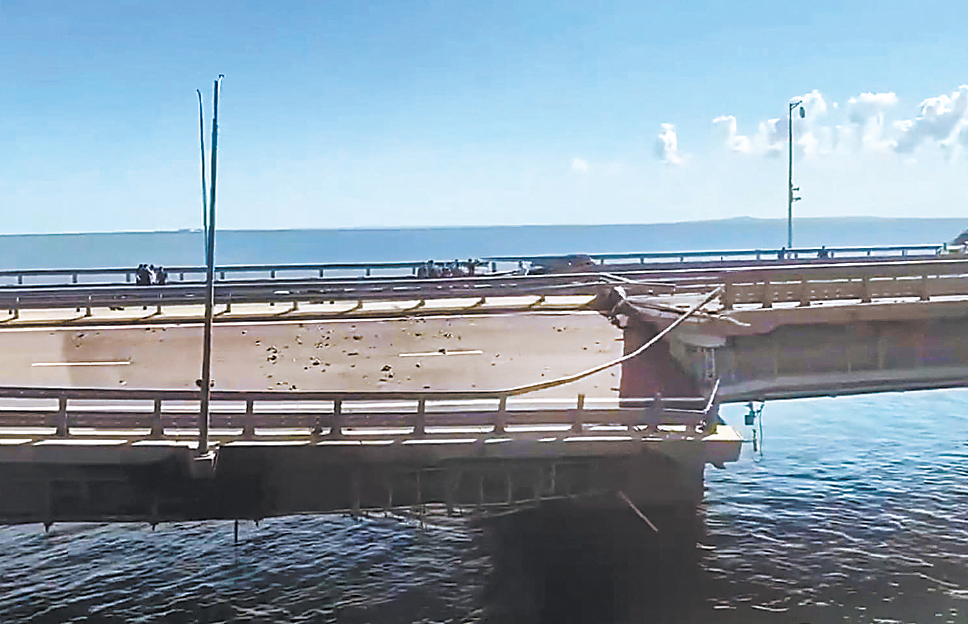 克里米亚大桥17日遭到袭击。图为当地媒体Сrimea24TV拍摄的视频截图,显示大桥路面严重受损。