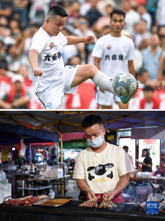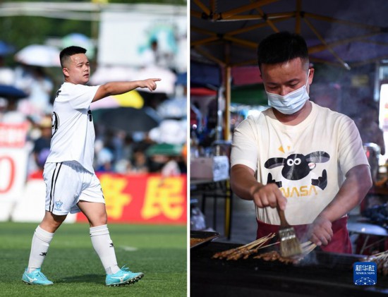 拼版照片:左图为7月15日,六佰塘村足球队球员杨宗维在比赛中组织进攻;右图为7月16日,杨宗维在烧烤摊给客人烤肉串。杨宗维是一名厨师兼烧烤摊老板,他在球队里任后腰。新华社记者 杨文斌 摄