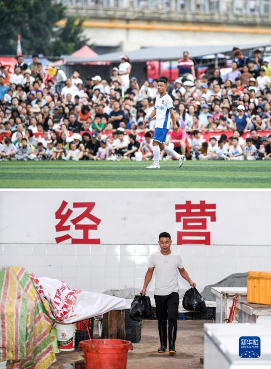 拼版照片:上图为7月15日,丰乐村一队球员贾勇辉在赛场上观察;下图为7月15日,贾勇辉在农贸市场给客户送豆芽。贾勇辉是一名卖菜小贩,平时靠制作和批发豆芽贴补家用,他在球队里任后腰。新华社记者 杨文斌 摄