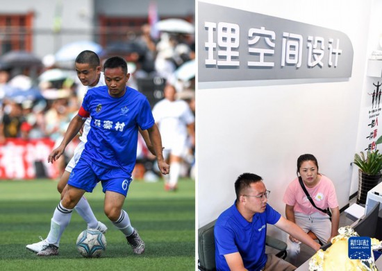 拼版照片:左图为7月15日,月寨村足球队球员李远攀在赛场上拼抢;右图为7月16日,李远攀(左)在装修设计公司给客户讲解电脑设计图。李远攀是一名室内装修设计师,也是月寨村足球队队长。新华社记者 杨文斌 摄