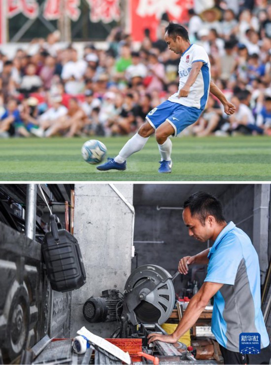 拼版照片:上图为7月15日,丰乐村一队球员朱永辉在赛场上开球;下图为7月14日,朱永辉在建材装修门店里加工建材。朱永辉是一名装修建材加工工人,在球队里任中后卫。新华社记者 杨文斌 摄