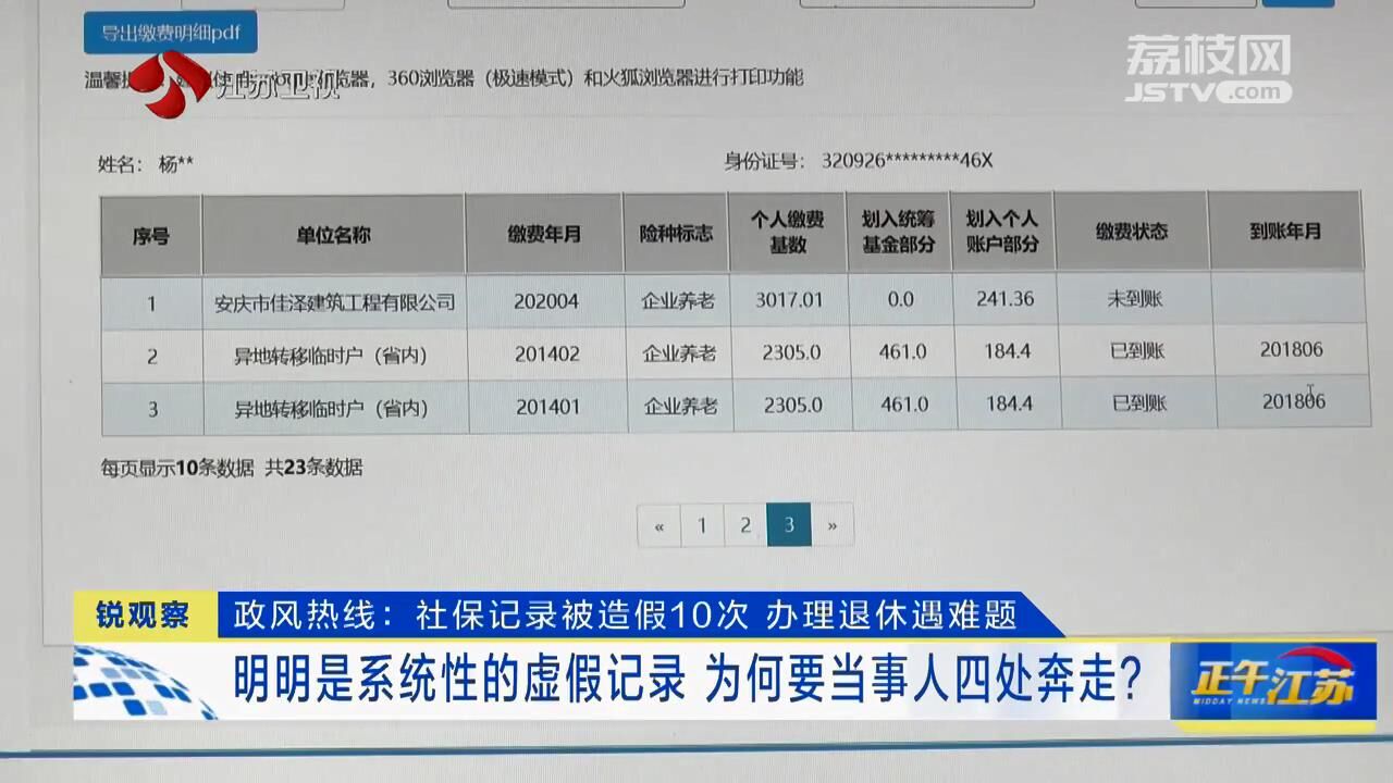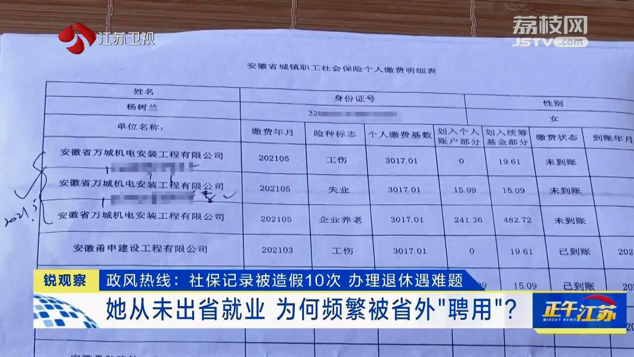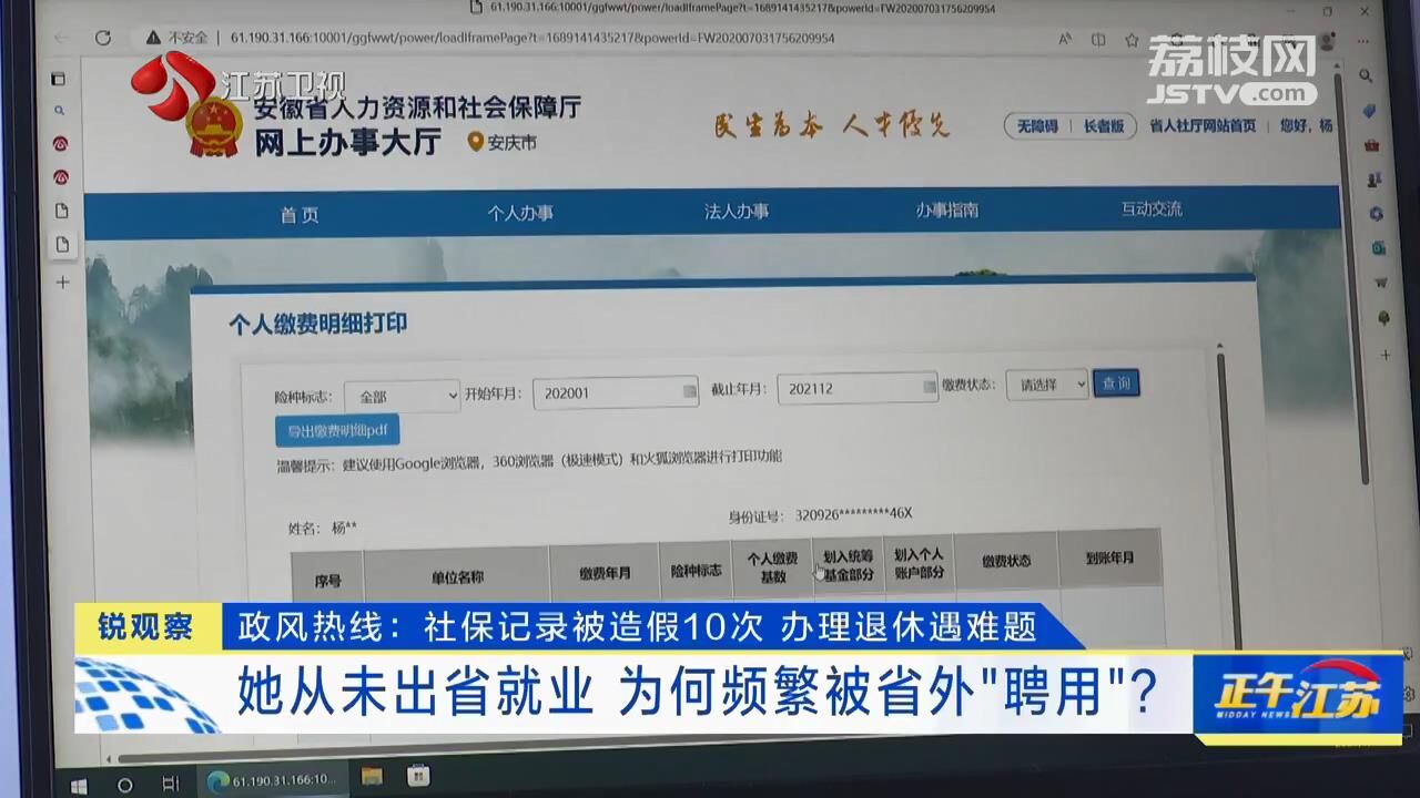 江苏盐城市大丰区观众杨女士拨打我们025-83195110新闻热线反映,她在办理退休手续时突然被告知,自己在外省还有好几份虚假的社保缴费记录。杨女士多地奔跑,却无法完全清除这些莫名其妙的缴费记录,导致她无法正常办理退休,这到底是怎么回事呢?今天的直播中,人社部门也做出了现场回应。