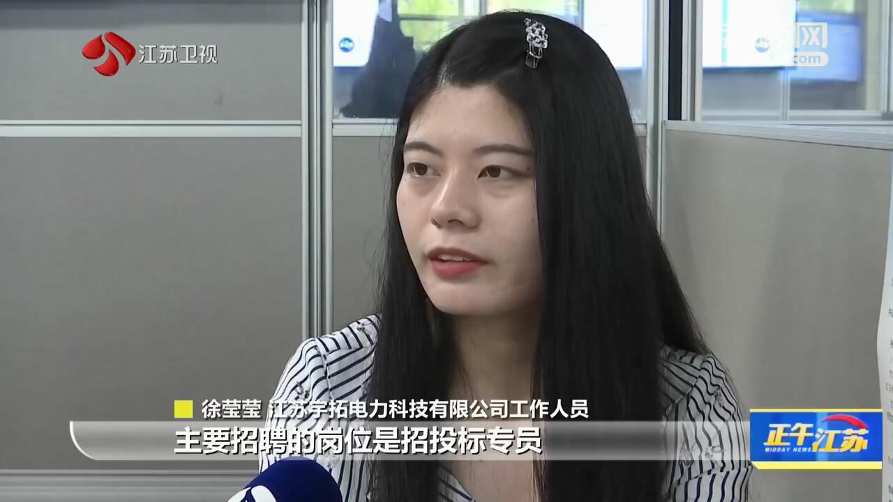 江苏宇拓电力科技有限公司工作人员徐莹莹说:“主要招聘的岗位是招投标专员、销售专员和线上推广这三个岗位,我们是电力方面的,我们更希望招一些学电力方面专业、电力工程相关专业的应届毕业生,每月5000到7000元的薪资,五险一金都是有的。”