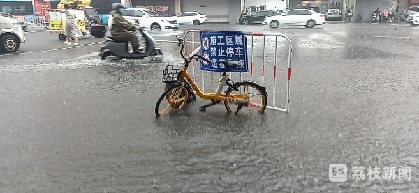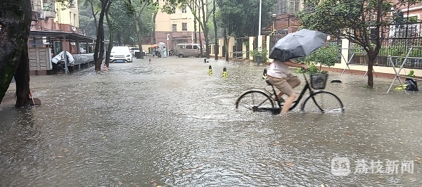 暴雨哗哗下,随既走访发现,南京主城区玄武区北安门街道路有大量积水,车辆经过时,如水上行舟,劈波斩浪。路中有一口窨井盖被打开,周围放着一辆共享单车和围栏,街道城管站在路边提醒骑车人注意安全。