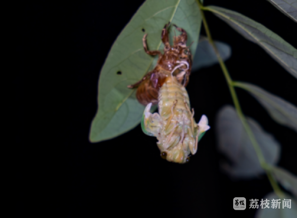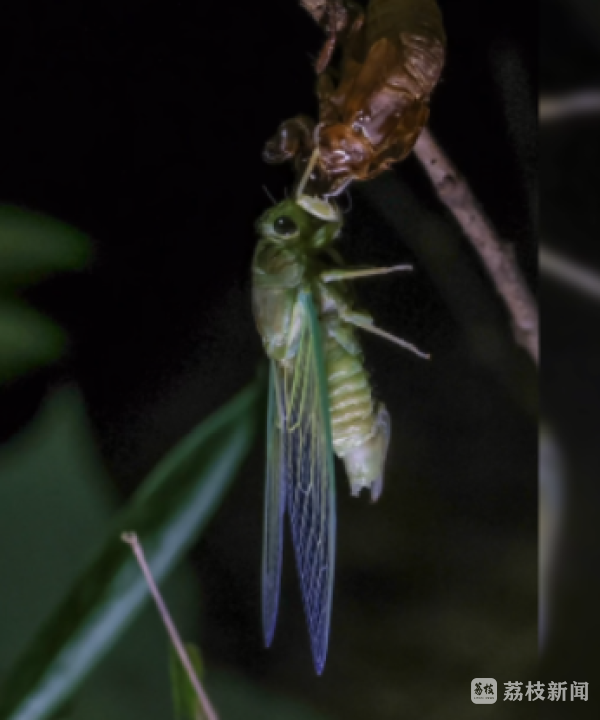 7月18日晚9点左右,常州溧阳市的摄影爱好者邵良在天目湖镇一处山林里,费时3小时,用延时摄影记录了一只绿色薄翅蝉脱壳羽化的全过程。镜头下,一只蝉慢慢挣脱出被包裹的外壳后,舒展开柔嫩的羽翼,实现了一场完美的“重生”,展现出蓬勃的生命力。
