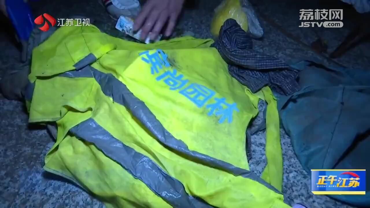 到了晚上,雨水小了,在沿途步道上,蒋先生发现了一个布袋子。袋子里面装了一些衣服和随身携带的物品,袋子上也有所属的园林公司名字,看来正是躲雨的工友留下的。