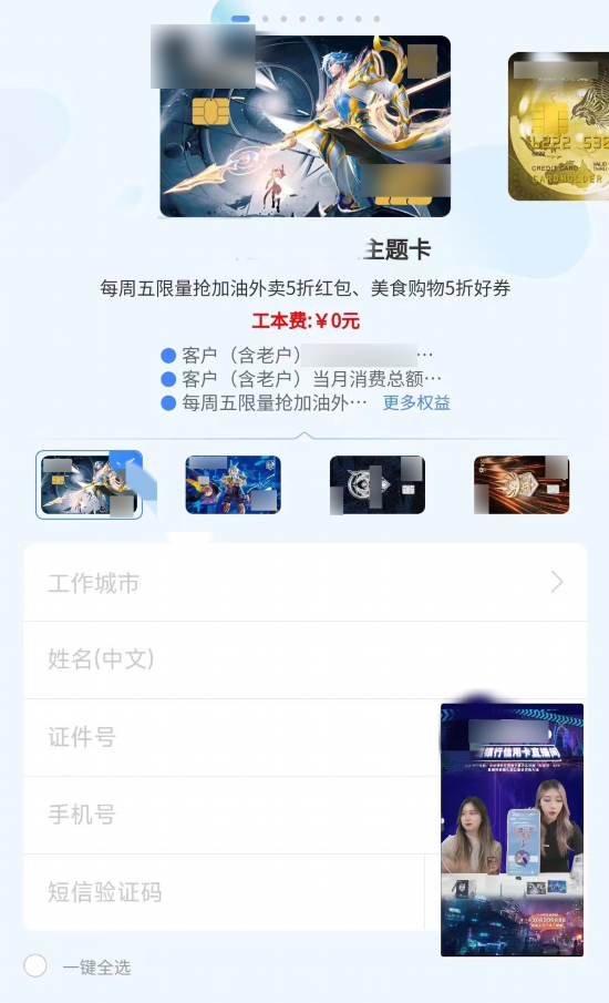 另一家银行直播间挂上了八种不同IP联名卡,最受关注的一张卡片是和某游戏合作,实体卡上印有游戏图案。点开直播间右下角的“风车”标志,就直接进入到填写个人信息、申请办卡的页面。