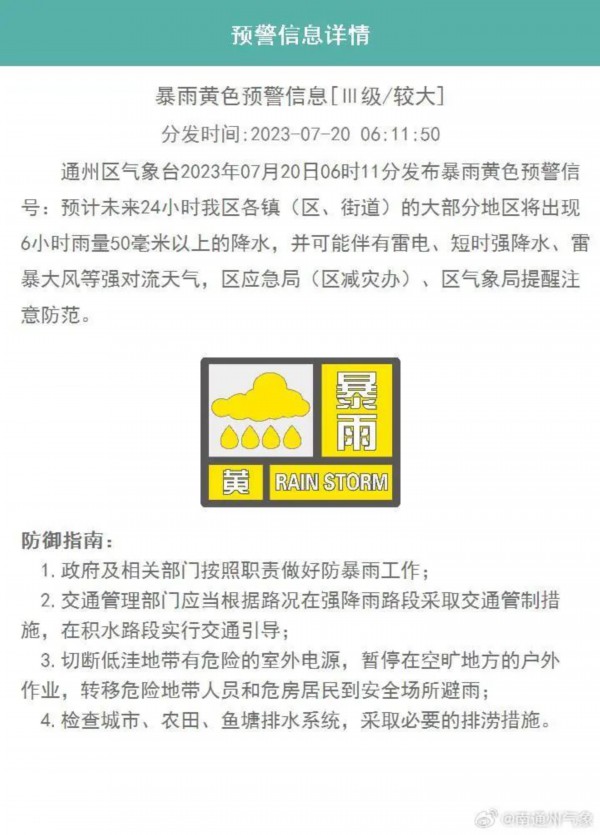 通州区气象台2023年07月20日06时11分发布暴雨黄色预警信号