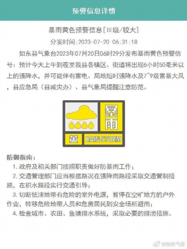 如东县气象台2023年07月20日06时29分发布暴雨黄色预警信号