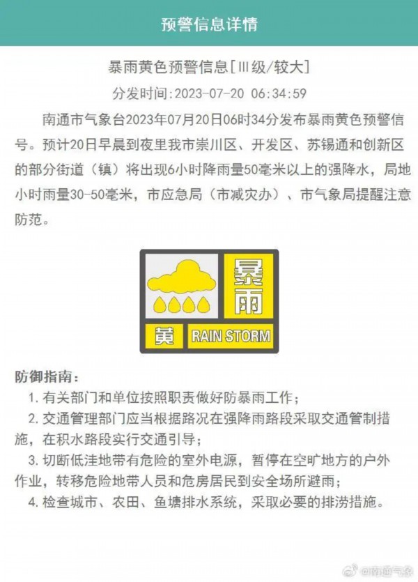 南通市气象台2023年07月20日06时34分发布暴雨黄色预警信号。预计20日早晨到夜里南通市崇川区、开发区、苏锡通和创新区的部分街道(镇)将出现6小时降雨量50毫米以上的强降水,局地小时雨量30-50毫米,市应急局(市减灾办)、市气象局提醒注意防范。