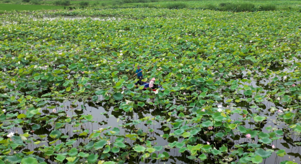 塔集镇水生蔬菜专业合作社负责人任桂彬站在岸边,笑得合不拢嘴:“今年试种的新品种大丰收了,一亩能比往年多产近1000头呢!”从2021年开始种植莲蓬以来,合作社的莲蓬已经辐射了周边500亩水域。在前两年销售大获成功的基础上,今年他们从武汉市蔬菜科学研究所引种了“满天星”,从金华市农科院引种了“芙蓉1号”“芙蓉2号”,预计一亩纯收入至少能达到五六千元。