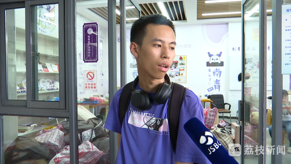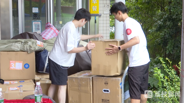 南京大学商学院志愿者殷晟皓说:“他们是行李先到,人会迟一点到,所以我们先把行李搬到学院各自的区域,等他们人到了,再帮他们把行李搬上去。”