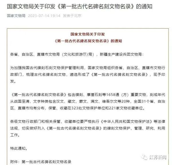 为加强我国古代碑刻石刻文物保护管理利用,国家文物局组织各省、自治区、直辖市文物行政部门,梳理古代名碑名刻文物,送选形成了《第一批古代名碑名刻文物名录》,包含碑刻、摩崖石刻等1658通(方)重要文物,刻成年代从战国至清,文字种类包含汉文、藏文、蒙文、满文、维吾尔文等20种,全国31个省、自治区、直辖市均有分布,保管、收藏在323处文物保护单位和221家文物收藏单位。