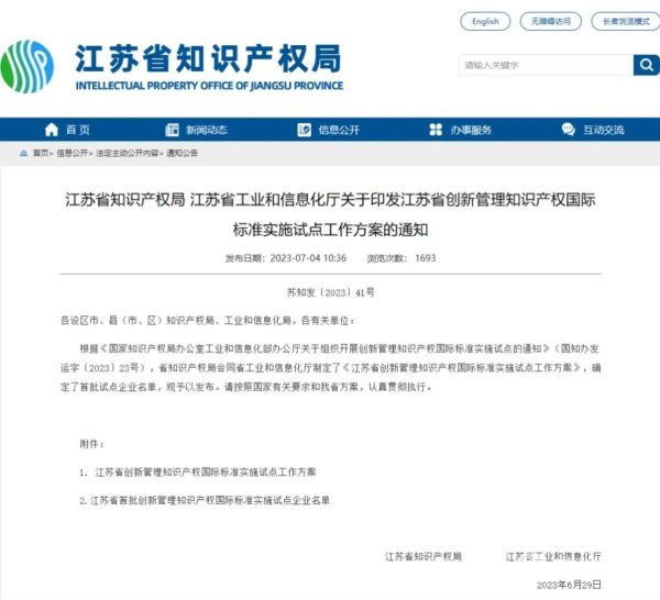 近日,省知识产权局联合省工业和信息化厅发布了《江苏省创新管理知识产权国际标准实施试点工作方案》,确定了首批试点企业名单,盐城建湖县4家企业榜上有名。分别是江苏华威机械制造有限公司、江苏铭星供水设备有限公司、江苏丰信航空设备制造有限公司、建湖县鸿达阀门管件有限公司。
