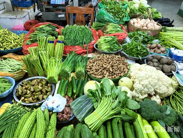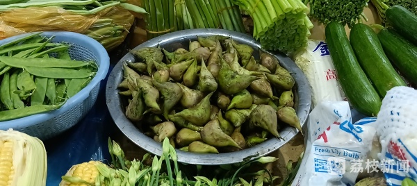 在南京玄武区一农贸市场看到,柜台上各种新鲜蔬菜琳琅满目,汇聚满满人间烟火气。发现一蔬菜摊位都摆上了一种水中果——菱角,悄悄上市,并登上了菜市时鲜摊位“C位”! 还有新鲜花生。