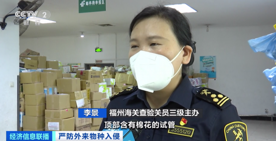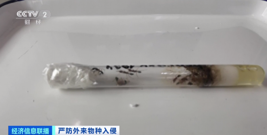 福州海关查验关员三级主办 李景:发现该邮件中的泡沫盒内,有一个底部含培养基、顶部含有棉花的试管,中部有蚂蚁活动。