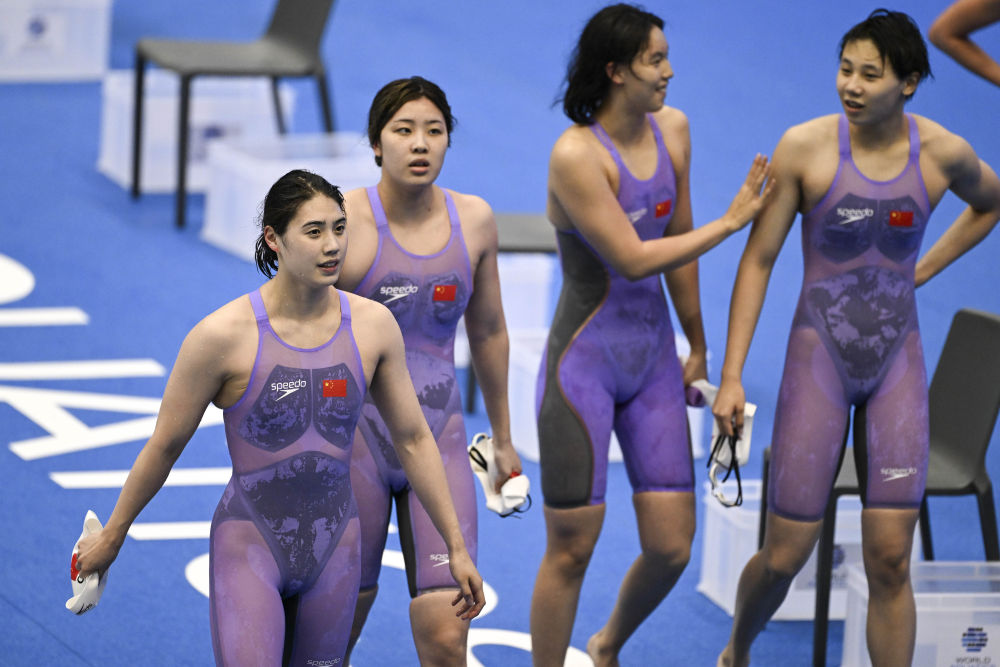 7月23日,中国队选手张雨霏(左一)、吴卿风(左二)、杨浚瑄(右二)、程玉洁(右一)在决赛后。新华社记者许畅摄