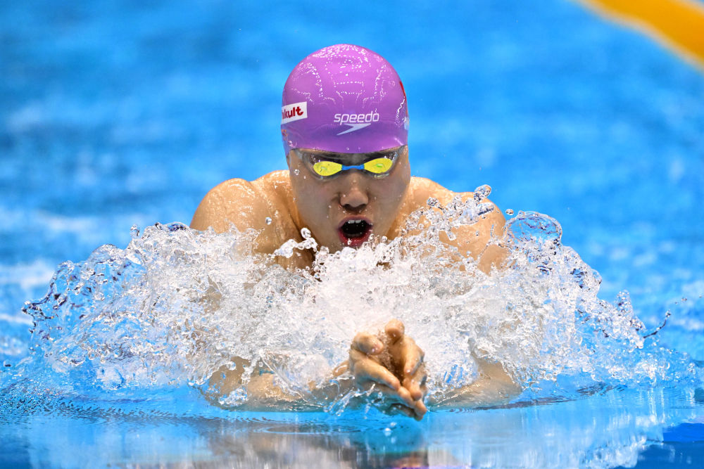 7月23日,中国选手覃海洋在男子100米蛙泳半决赛中。新华社记者张笑宇摄