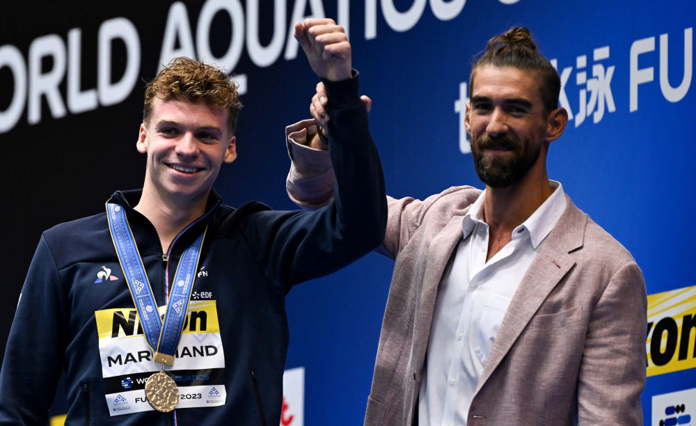 7月23日,法国选手马尔尚 (左)和美国名将菲尔普斯在颁奖仪式上合影留念。新华社记者夏一方摄
