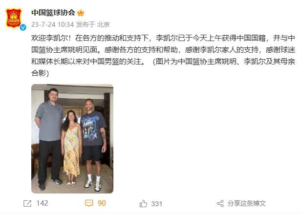 荔枝新闻讯 7月24日,中国篮协正式宣布归化球员李凯尔入籍成功。欢迎李凯尔!在各方的推动和支持下,李凯尔已于今天上午获得中国国籍,并与中国篮协主席姚明见面。感谢各方的支持和帮助,感谢李凯尔家人的支持,感谢球迷和媒体长期以来对中国男篮的关注。