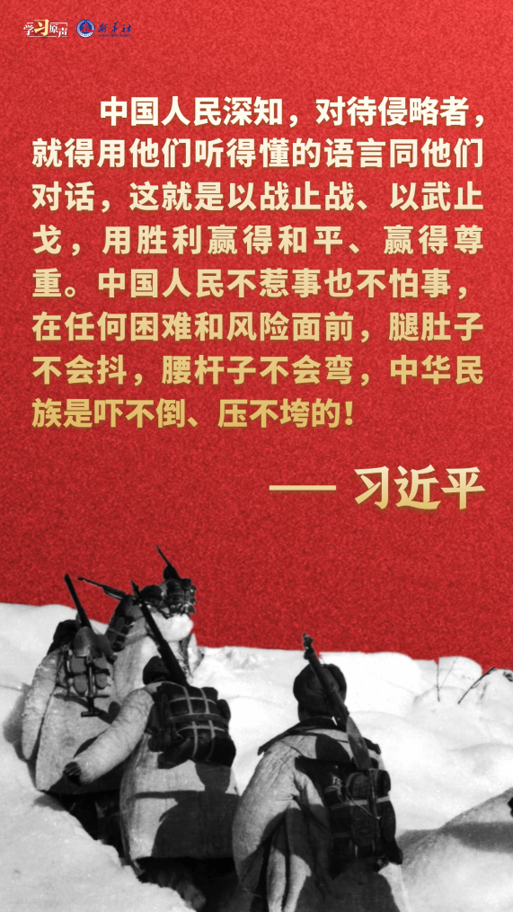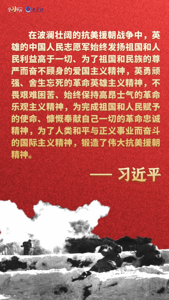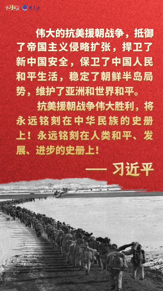 伟大抗美援朝精神跨越时空、历久弥新。我们要铭记抗美援朝战争的艰辛历程和伟大胜利,敢于斗争、善于斗争,知难而进、坚韧向前,把新时代中国特色社会主义伟大事业不断推向前进。