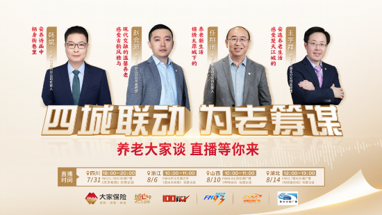 大家保险集团有限责任公司(以下简称“大家保险”)紧扣国家需要和民生关切,将养老作为发展的核心战略,通过打造“保险+养老服务”生态链,为解决养老难题贡献保险力量。2023年是大家保险成立的四周年,也是大家保险深耕城心养老的第四年,以此为契机,7月31日起大家保险将重启新一轮谈话类栏目《养老大家谈》。本次栏目的主题为“四城联动·为老筹谋”,栏目将通过电台访谈的形式,聚焦养老话题,为更多家庭带来养老解决方案。