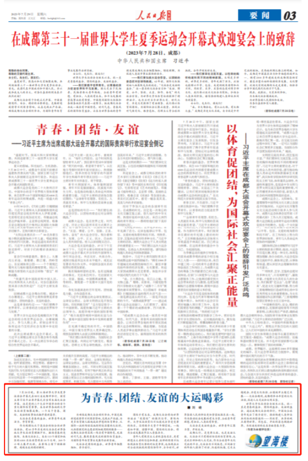 世界大学生运动会自诞生以来,就一直是青春的盛会、团结的盛会、友谊的盛会。通过成都大运会的举行,中国向全球青年发出了携手前行、推动构建人类命运共同体的热情邀约——用欣赏、共享的观点看待世界,用包容、开放的姿态拥抱世界,为创造美好的未来贡献青春力量。