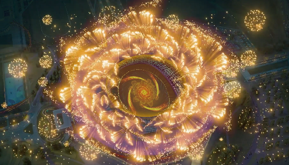 此次焰火表演以金色为主要视觉元素,象征青春光彩、活力绽放。用焰火展现世界大学生在中国成都相聚携手、团结进取,表达为构建人类命运共同体贡献青春力量的共同心愿,描绘面向未来、共创明天的绚丽画卷。