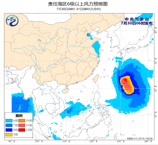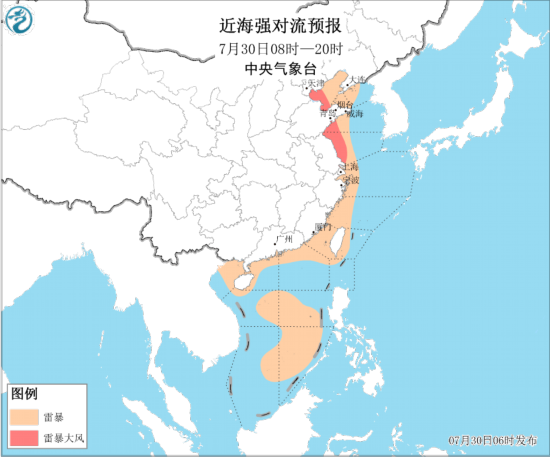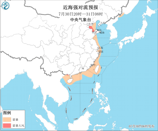 7月30日白天至夜间,渤海湾、莱州湾、山东半岛南部沿岸海域、江苏沿岸海域将有8~10级雷暴大风。