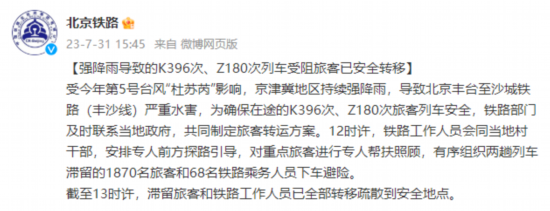 受今年第5号台风“杜苏芮”影响,京津冀地区持续强降雨,导致北京丰台至沙城铁路(丰沙线)严重水害,为确保在途的K396次、Z180次旅客列车安全,铁路部门及时联系当地政府,共同制定旅客转运方案。12时许,铁路工作人员会同当地村干部,安排专人前方探路引导,对重点旅客进行专人帮扶照顾,有序组织两趟列车滞留的1870名旅客和68名铁路乘务人员下车避险。