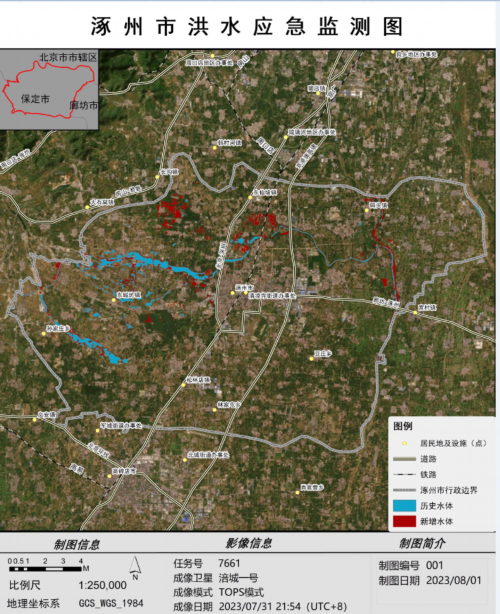 “涪城一号”卫星涿州市洪水应急监测图20230731。卫星影像表明,受上游洪水过境影响,涿州市河道行洪和城市内涝风险加剧,防汛形势十分严峻。境内北拒马河、小清河、白沟河等多条河流流量增大。