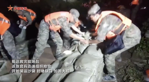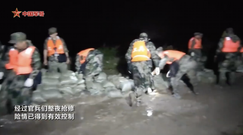 7月31日,接到上级命令后,陆军第82集团军某旅官兵连夜火速前往涿州,在望海庄村、朱庄村实施大堤抢险加固任务。