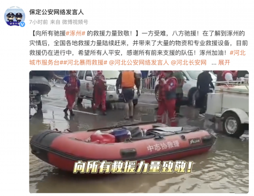 8月1日傍晚,@保定公安网络发言人 发博,感谢各地救援队的到来:“在了解到涿州的灾情后,全国各地救援力量陆续赶来,并带来了大量的物资和专业救援设备,目前救援仍在进行中,希望所有人平安,感谢所有前来支援的队伍!”