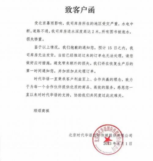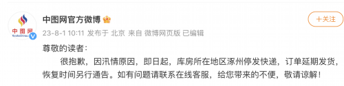 8月1日,@中图网官方微博 发博称,因汛情原因,即日起库房所在地区涿州停发快递,订单延期发货。“从7月31日晚到现在,涿州书业已经陆陆续续有很多家仓库被淹……大家都在奋力自救,有的还没有消息,有的已经无奈宣布一切归零。”
