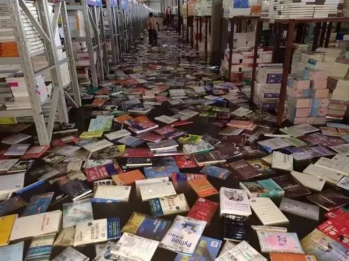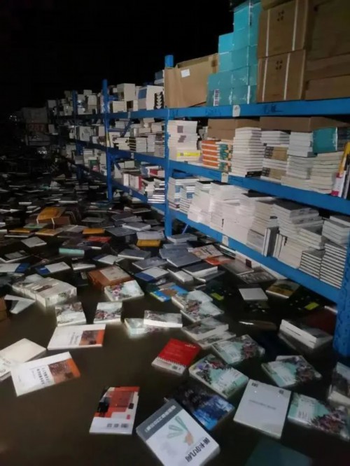 而与西南物流中心一墙之隔的主做馆配的北京天问求索文化发展有限公司库房,库房整个被淹,其负责人袁女士称“库房全淹了”,损失上亿。
