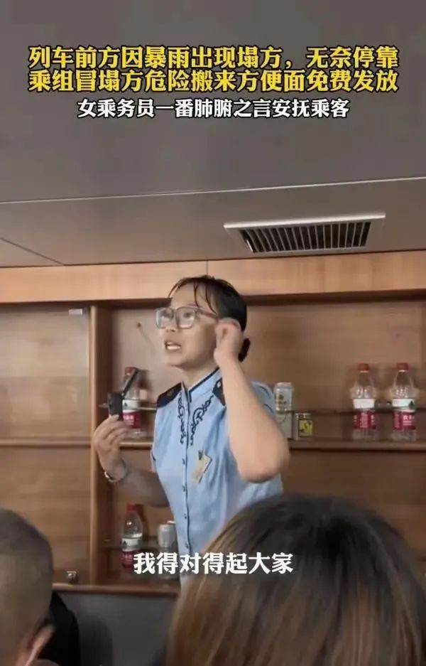 7月31日清晨,旅客逐步向餐车聚集,人越来越多,不少旅客情绪激动,列车长杨龙带领乘务班组人员一边发放物资,一边安抚旅客。列车员赵阳哽咽向大家喊话:“大家千万不要拥挤,不要发生任何危险,我就是因为穿了这身衣服,我得对得起大家。”此刻,旅客的情绪得以逐步平复。